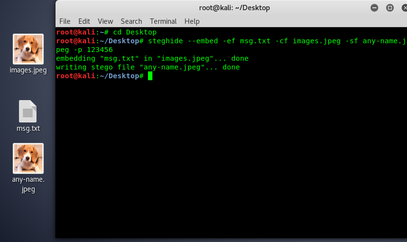 steghide --embed -ef msg.txt -cf images.jpeg -sf any-name.jpeg -p 123456