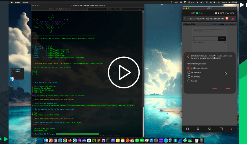 The tool hosts a fake website which uses an iframe to display a legit website and, if the target allows it, it will fetch the Gps location (latitude and longitude) of the target, capture multiple pictures of the target along with IP Address and Device Information.