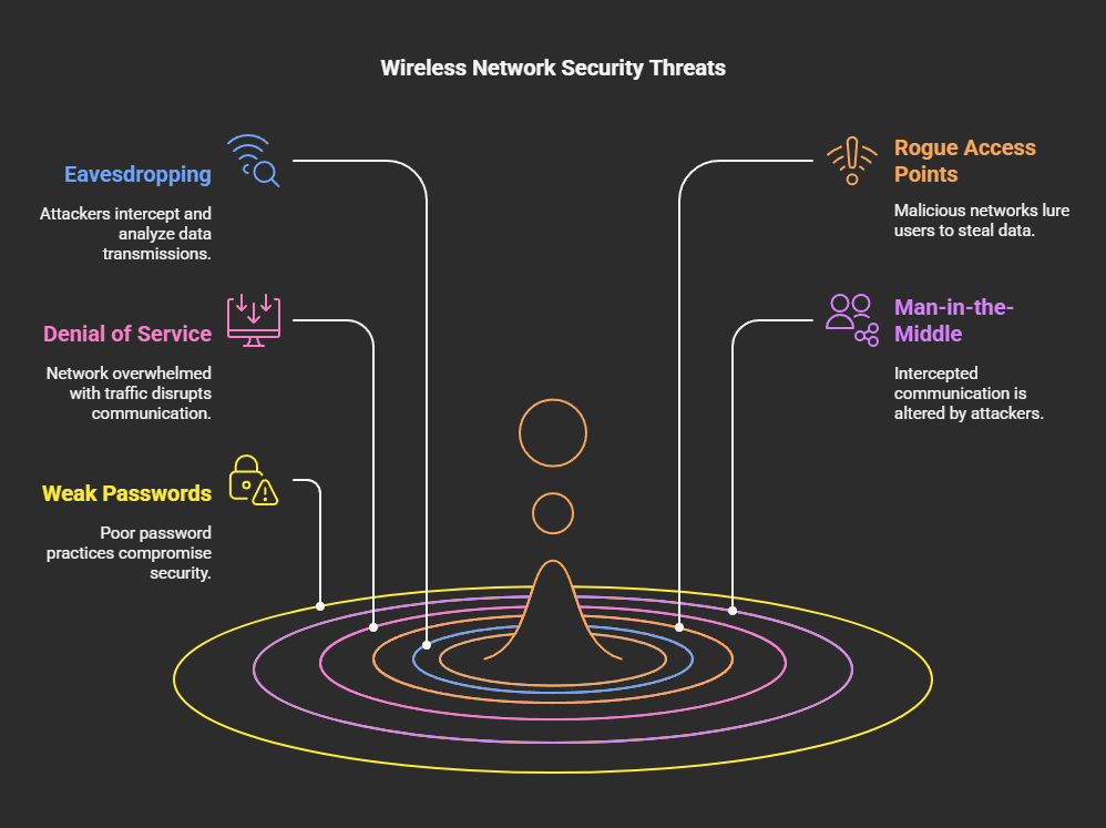 Attackers intercept and analyze data transmitted over wireless networks. Strong encryption helps prevent unauthorized access to intercepted data.