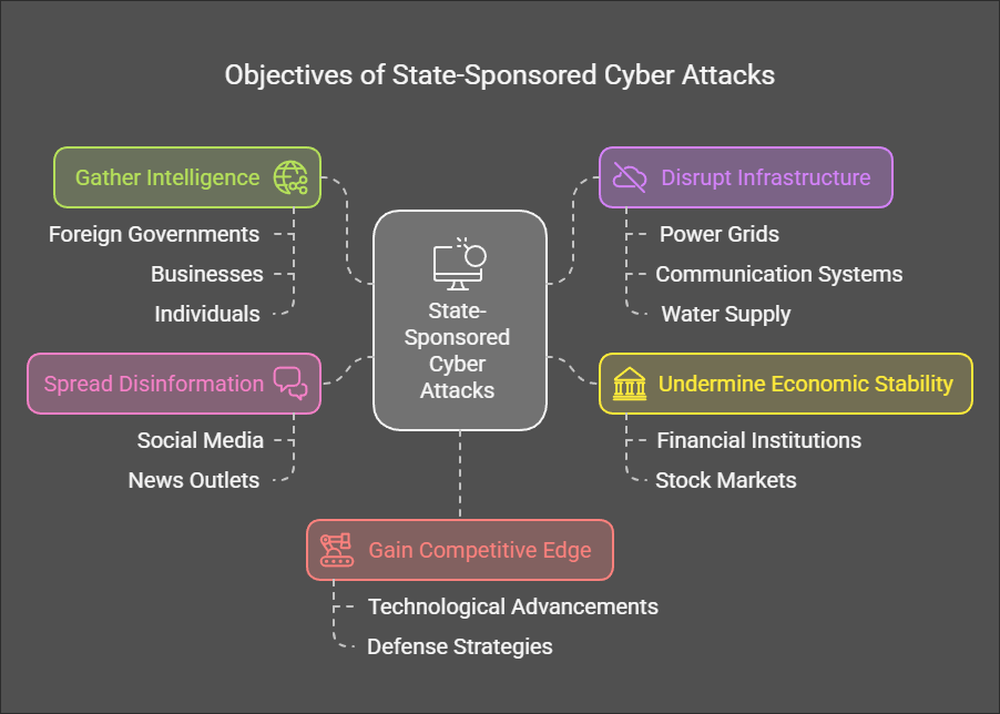 State-sponsored cyber attacks are malicious digital activities conducted by government-affiliated groups. These attacks are usually more sophisticated, well-funded, and persistent compared to independent hacking attempts. Governments leverage these attacks to: